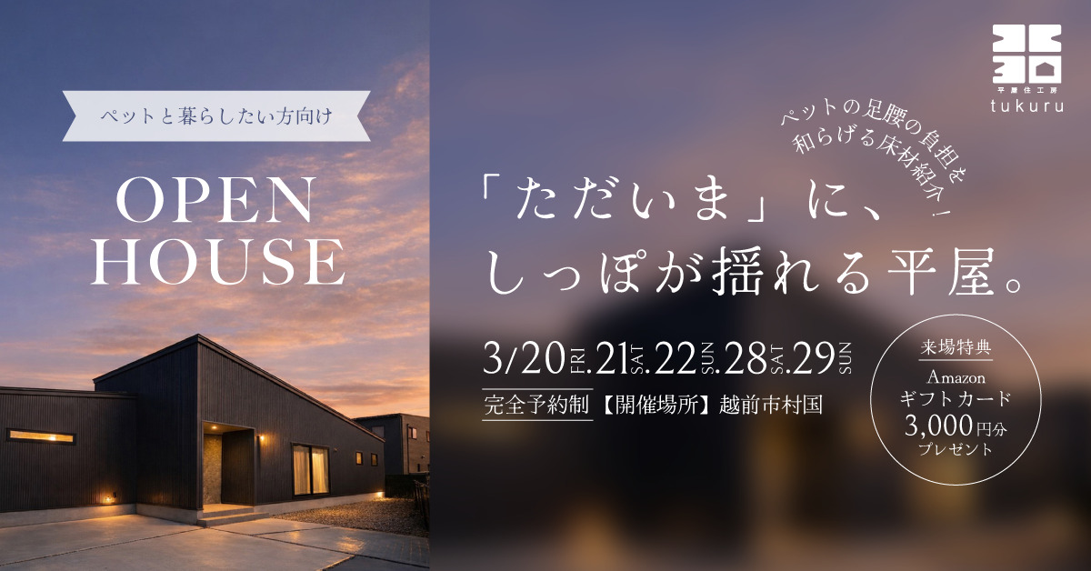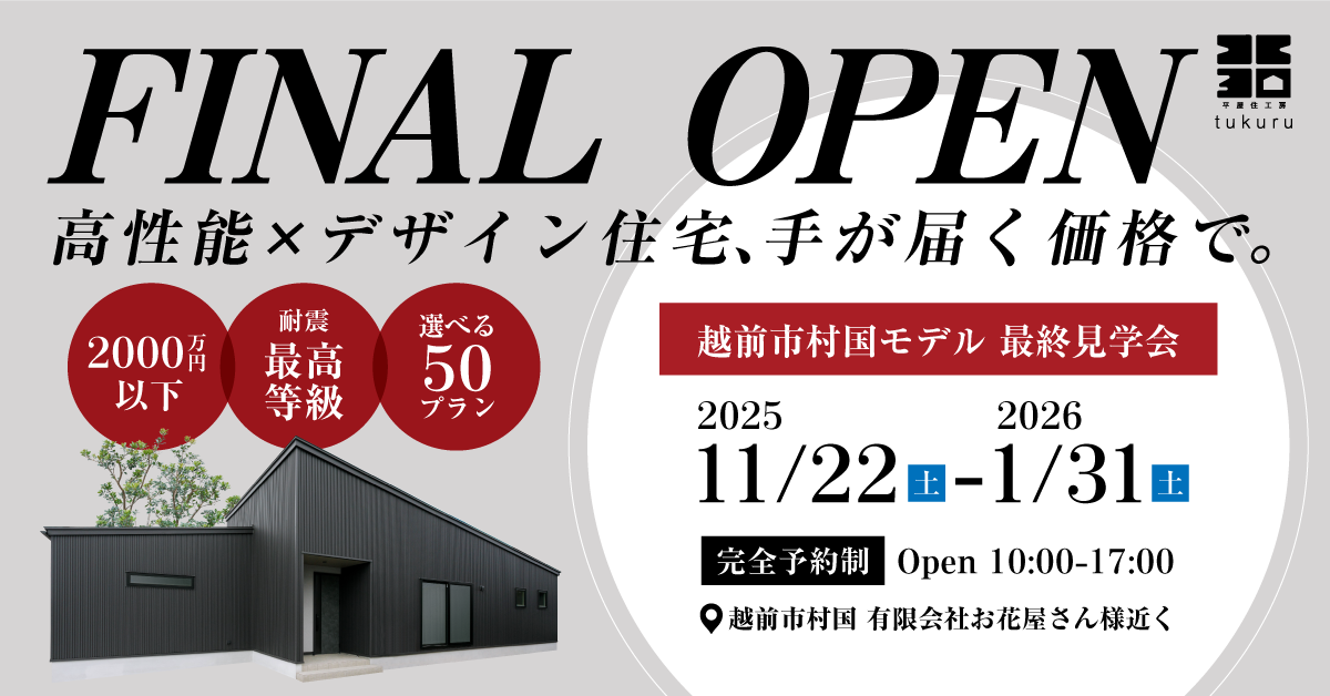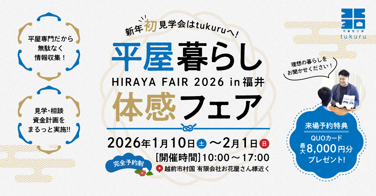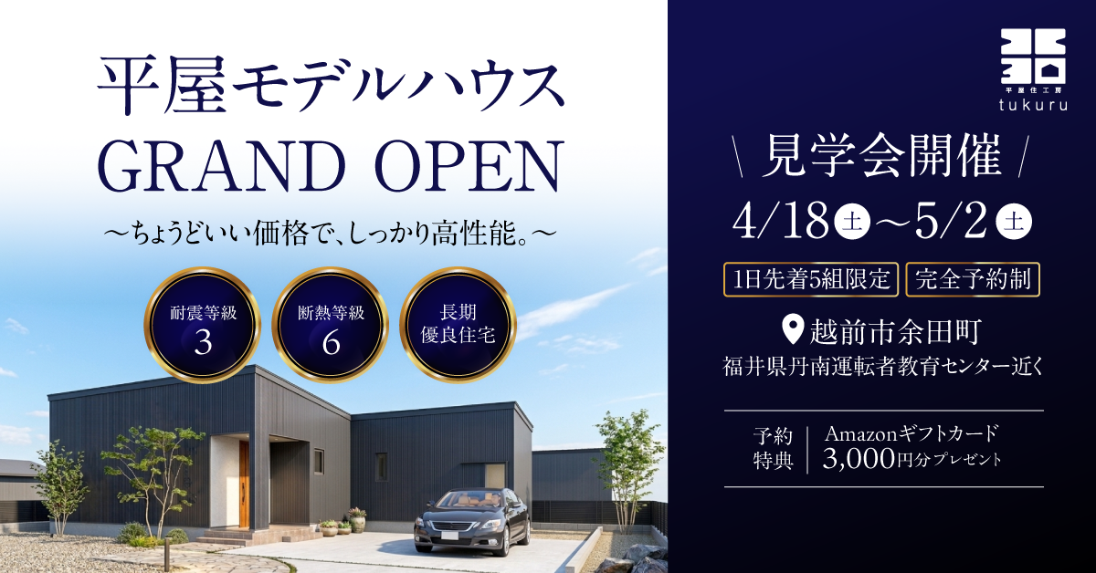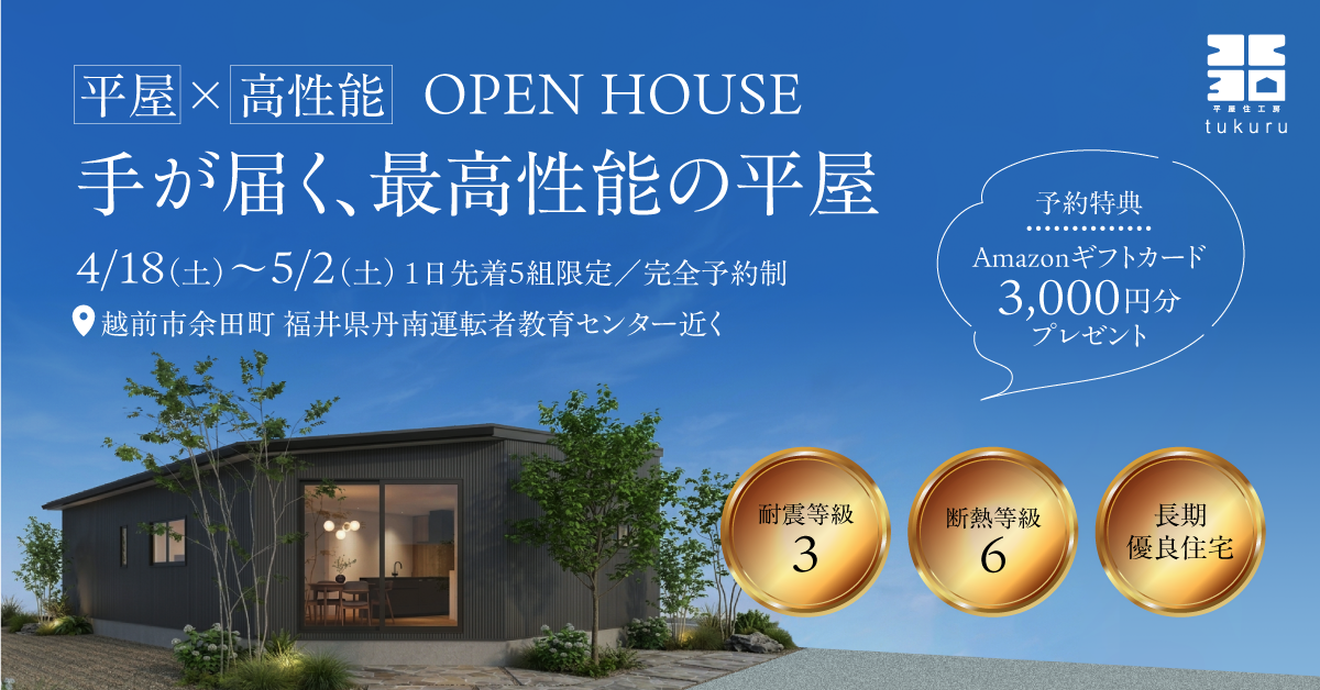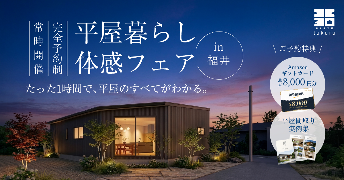 「tukuru」は、2000万円以内で叶えられる夢の平屋を提供します。長持ちする素材と耐震等級3の安心安全な住まいで、手が届く理想の家を実現します。安心と快適さを両立した、新しい平屋のスタンダードです。