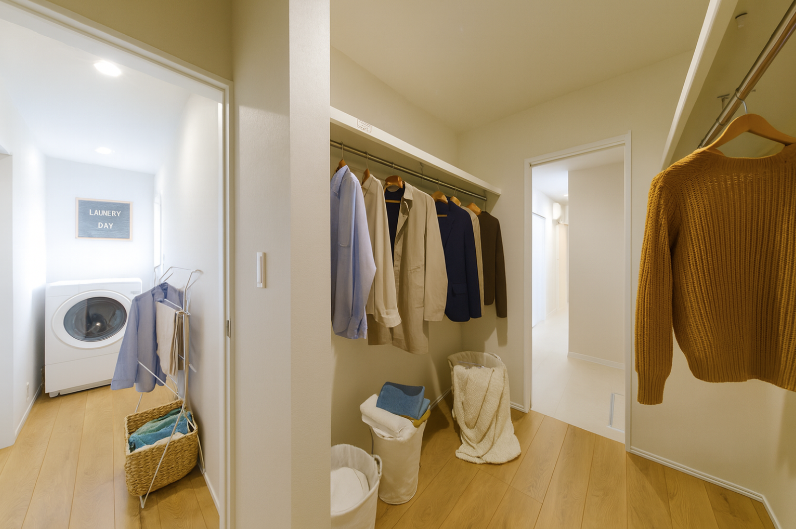 キッチン・洗面・収納がぐるっとつながる設計で、家事や生活動線がスムーズ。 無駄な移動が減って、毎日の家事が「時短&ストレスフリー」に。